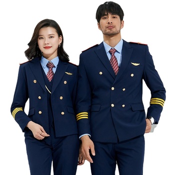 Venta al por mayor personalizado de alta calidad aerolínea aviación Negro Azul Marino hombres mujeres piloto uniformes del personal