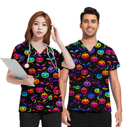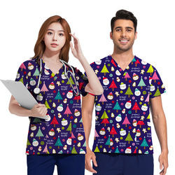 Navidad y Halloween nueva llegada Unisex alta calidad dibujos animados solo superior ropa de trabajo Spandex impreso enfermera uniforme Scrub Top