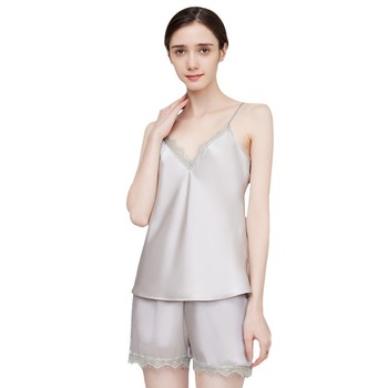ชุดนอนผ้าไหมสำหรับผู้หญิงชุดใส่อยู่บ้านสำหรับ19um ชุดนอนขาสั้นมีสายเอี๊ยมชุดนอนผ้าไหม100% ลูกไม้สำหรับฤดูร้อน